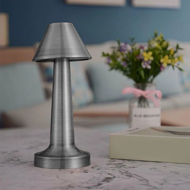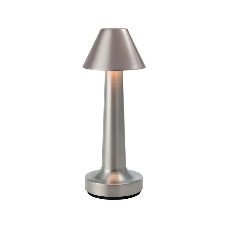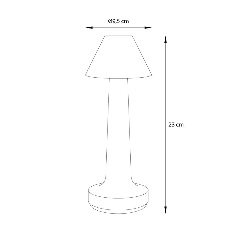 Lámpara de mesa Ivanna portátil inalámbrica. Ideal para ser instalada en interiores como living, comedores, dormitorios, oficinas, etc. Disponible en color cobre, aluminio y negro, dimeable de luz cálida, neutra a fría (de 4W a 1.5W). Mide 9,5 diámetro x 23 cm alto.